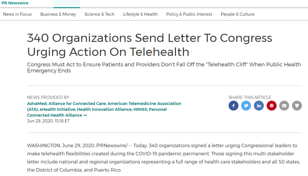 Press Air Visits supports letter to Congress urging for the continued expansion of telehealth following Congressional response to COVID-19 pandemic.